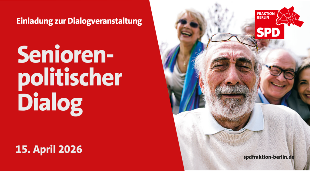 Liebe Berlinerinnen und Berliner, diese Einladung der SPD-Fraktion des Abgeordnetenhauses zum Seniorenpolitischen Dialog richtet sich an alle Interessierten: