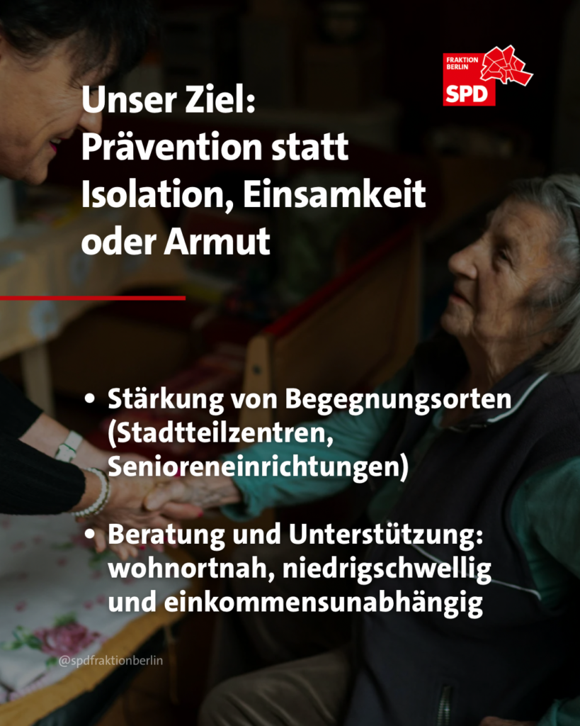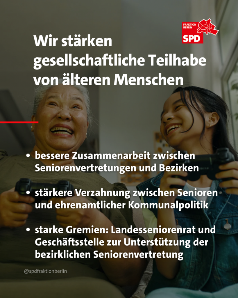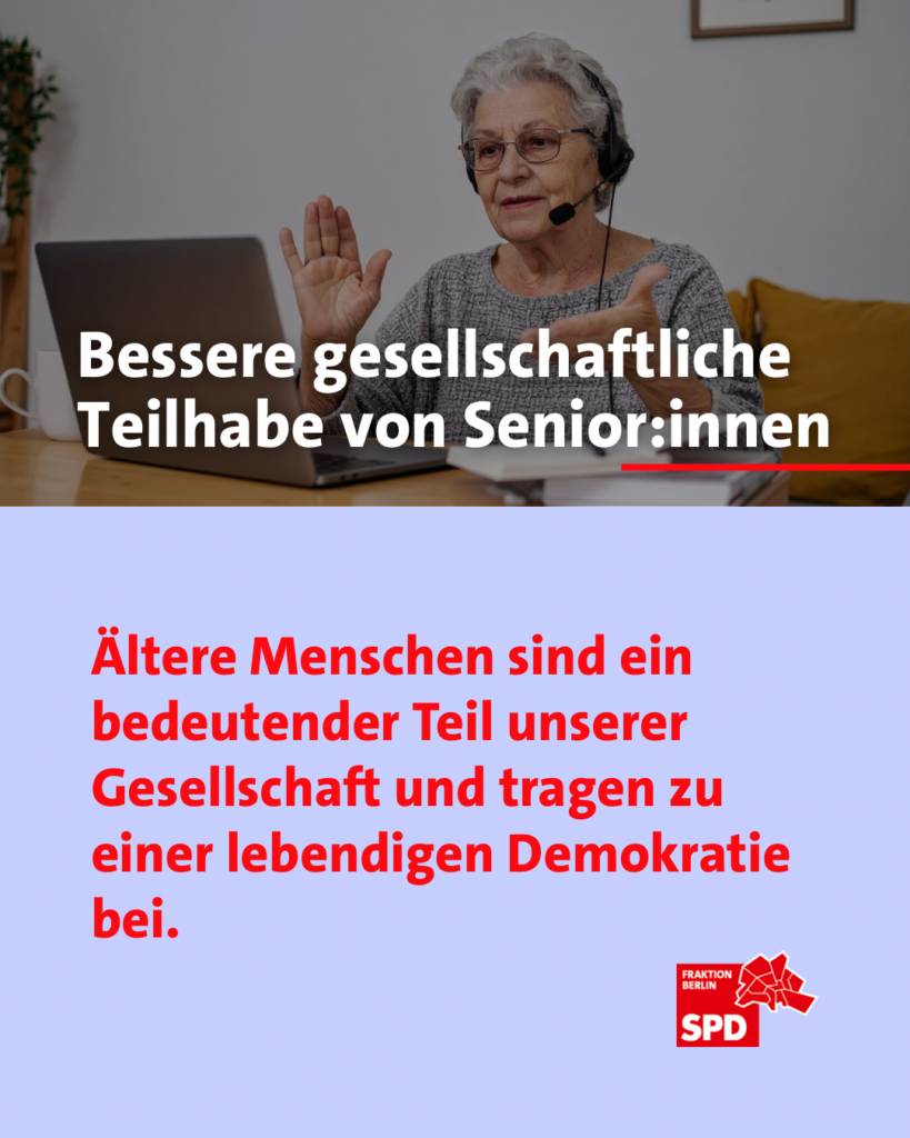 Ein weiterer Schwerpunkt: Ein gutes Leben im Alter ist eine zentrale Frage sozialer Gerechtigkeit. Als SPD-Fraktion verfolgen wir das Ziel einer solidarischen Gesellschaft, die allen Menschen unabhängig von ihrem Alter ein selbstbestimmtes Leben ermöglicht.